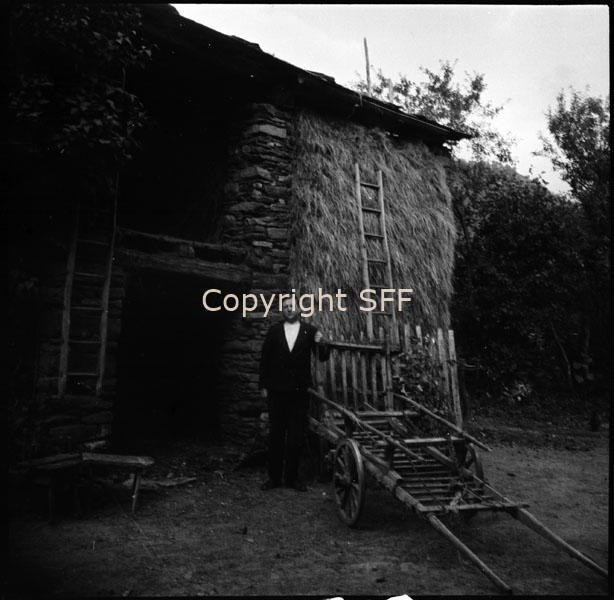 Uomo in posa con carro da carico e slitta da fieno sull'uscio di un fienile