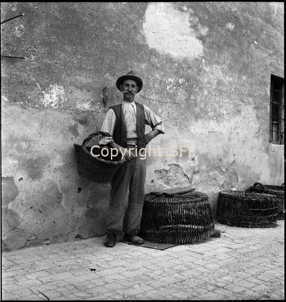 Ritratto del padre dell'informatore con cesto in vimini utilizzato per il trasporto di diversi materiali