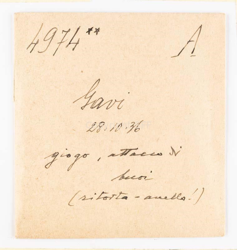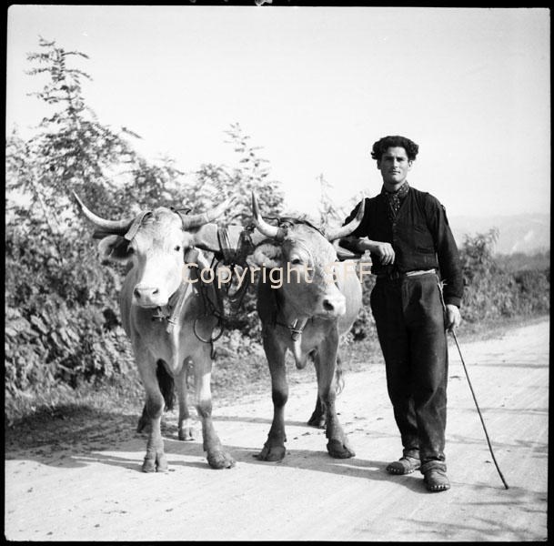 Uomo in posa con due bovini aggiogati