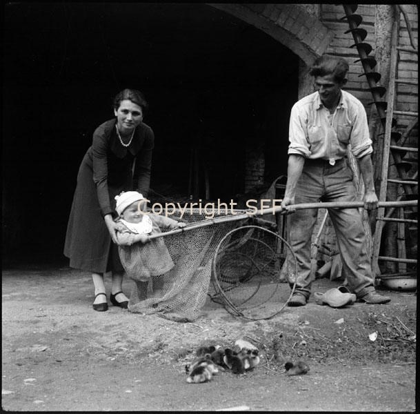 Uomo in posa con reti da pesca, una donna e un bambino