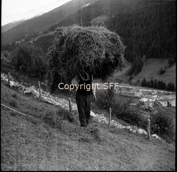 - Ritratto di uomo che porta sulle spalle uno strumento in legno costruito da due piastre rettangolari utilizzato per il trasporto del fieno