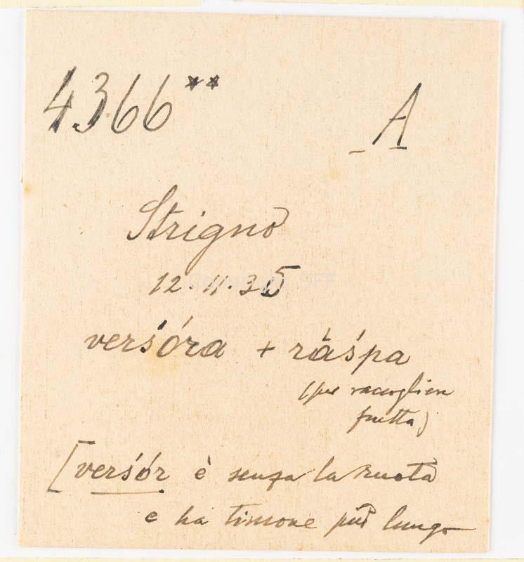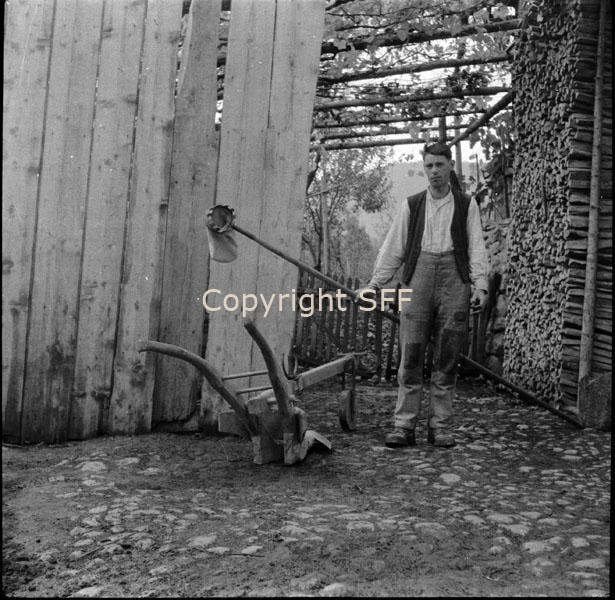 Aratro in legno con ruota anteriore; ritratto di contadino che tiene in mano uno strumento utilizzato per la raccolta della frutta