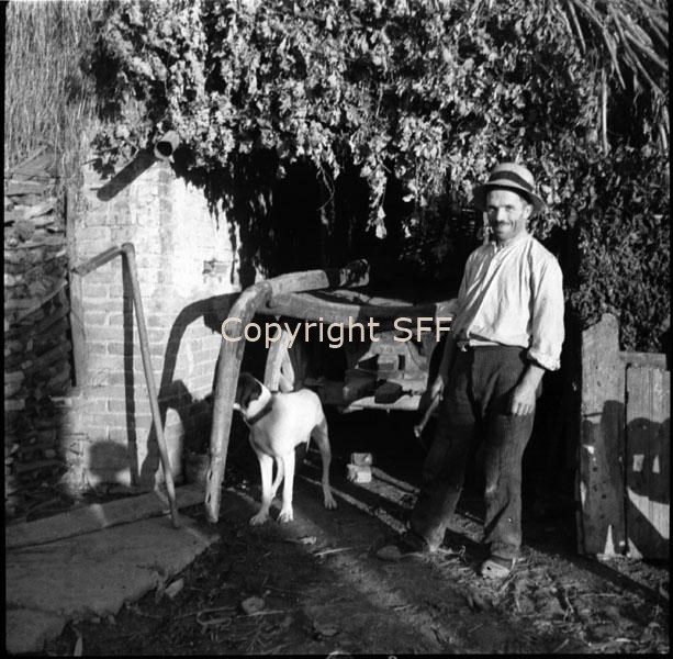 Uomo in posa con zappino e cane da tartufo accanto a zappa e timone di carro