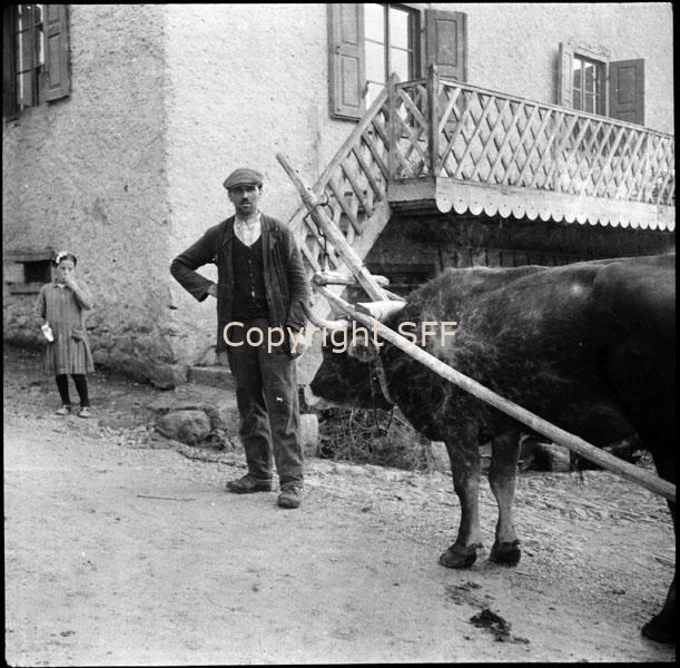 Uomo in posa davanti a un bovino aggiogato: ripresa posteriore del gioghetto