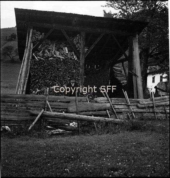 Uomo in posa dietro uno steccato presso un deposito di legna