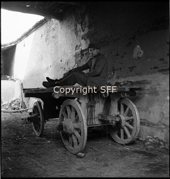Uomo in posa su un carro ripreso dalla parte posteriore