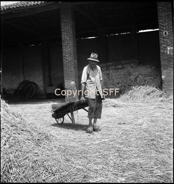 Vecchio servo in zoccoli al lavoro con una carriola