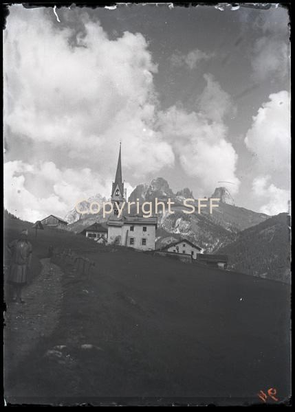 Veduta di Alba di Canazei: la chiesa sullo sfondo del Sassolungo