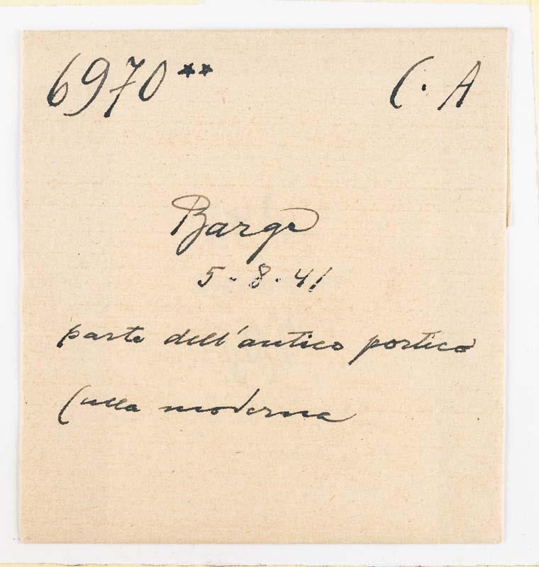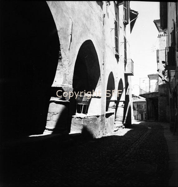 Veduta di Barge: portico antico (e una moderna culla di vimini)
