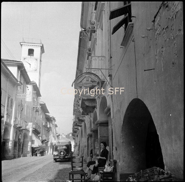Veduta di Demonte: l’insegna del fornaio sulla strada principale