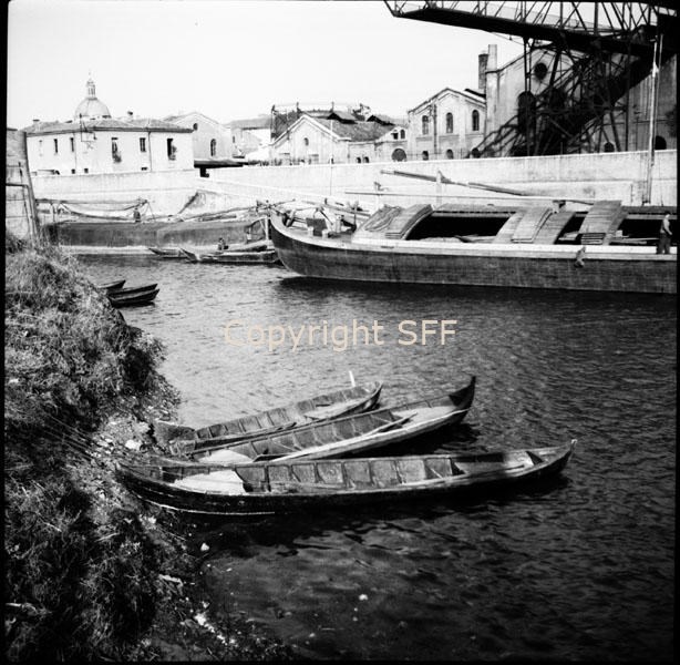 Veduta di Porto Catena a Mantova: barche da pesca e burcio