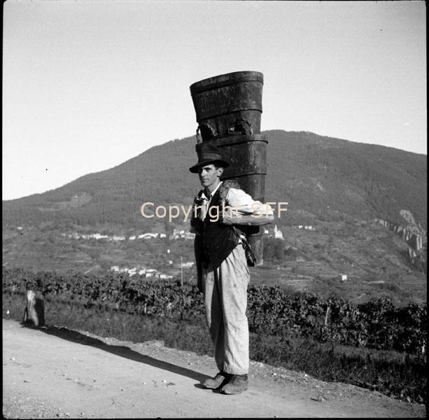 Vendemmiatore in posa con due brente vuote in spalla