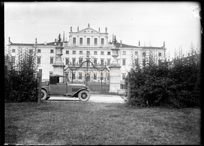 Villa Manin di Passariano e un'automobile. Villa Manin di Passariano è un complesso architettonico del XVIII secolo che fu dimora dell'ultimo doge di Venezia Ludovico Manin. Nel 1797 vi soggiornò Napoleone Bonaparte prima della firma del Trattato di Campoformio.