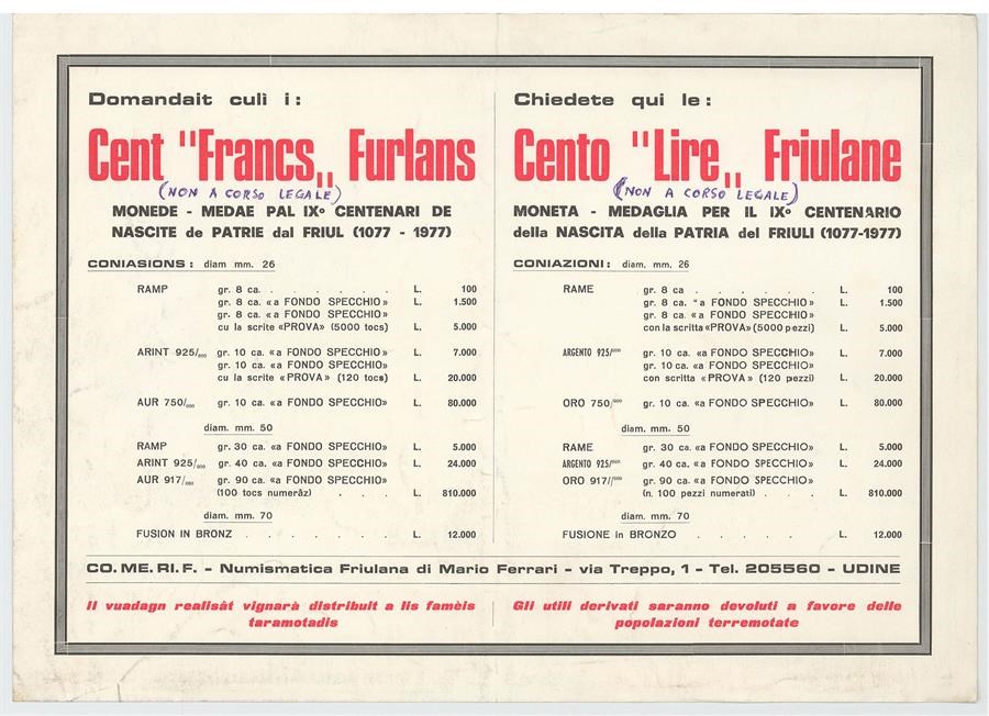 Cent "francs" furlans, monede - medae pal IX. centenari de nascite de Patrie dal Friul (1077-1977)