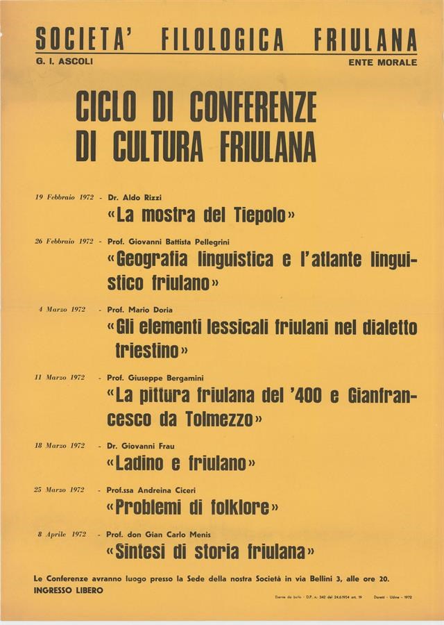 Conferenze organizzate dalla Società Filologica Friulana e a cura di Aldo Rizzi, Giovanni Battista Pellegrini, Mario Doria, Giuseppe Bergamini, Giovanni Frau, Andreina Ciceri e Gian Carlo Menis