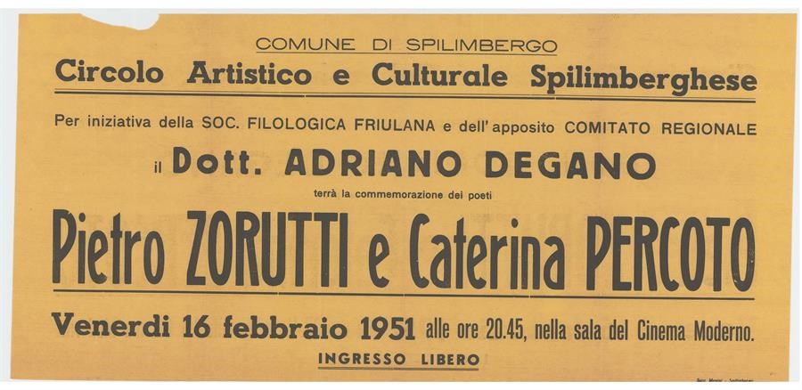 Commemorazione di Pietro Zorutti e Caterina Percoto a cura di Adriano Degano presso il Cinema Moderno di Spilimbergo