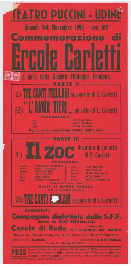 Programma della commemorazione di Ercole Carletti presso il Teatro Puccini di Udine, con canti friulani a cura della Corale di Ruda e la rappresentazione de "Il zoc" e de "L'amor vieri" di Ettore Carletti a cura della Compagnia dialettale della Società Filologica Friulana