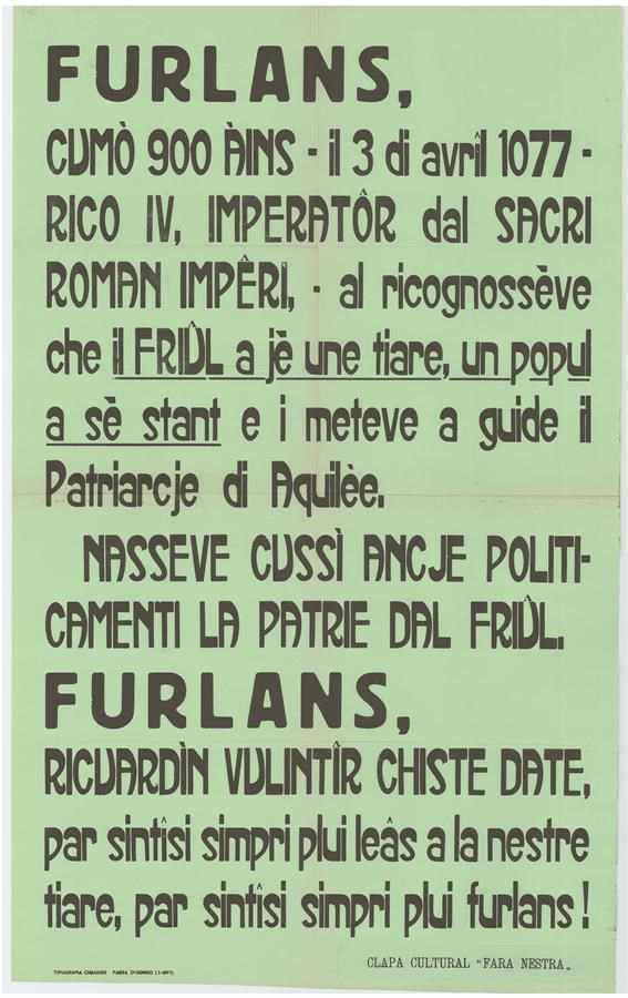 Furlans, cumò 900 àins - il 3 di avrîl 1077 - Rico IV, imperatôr dal Sacri Roman Impêri, al ricognossève che il Friûl a jè une tiare, un popul a sè stant ...