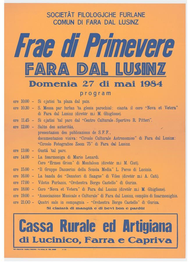 Programma della "Frae di primavere" organizzata dalla Società Filologica Friulana tenutasi a Farra d'Isonzo