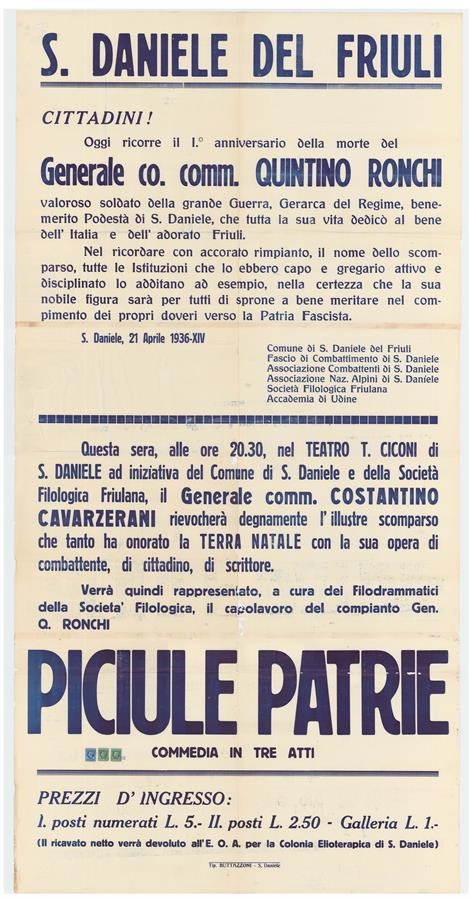 Programma della commemorazione di Quintino Ronchi presso il Teatro T. Ciconi di San Daniele del Friuli, con un discorso di Costantino Cavarzerani e la rappresentazione di "Piciule patrie" di Quintino Ronchi a cura della Compagnia filodrammatica della Società Filologica Friulana