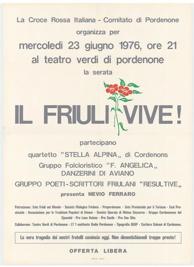 Serata organizzata dalla Croce rossa italiana-Comitato di Pordenone. Partecipano quartetto "Stella alpina" di Cordenons, gruppo folcloristico "F. Angelica" Danzerini di Aviano, gruppo poeti-scrittori friulani "Resultive"