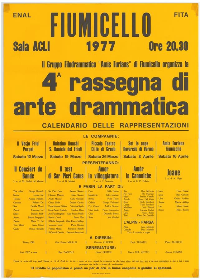 Calendario delle rappresentazioni: Il conciart de bande da parte della compagnia Il vecjo Friul, Porpetto; Il test di Sar Pieri Catus da parte della compagnia Quintino Ronchi, San Daniele del Friuli; Amor in villeggiatura da parte del Piccolo Teatro di Grado; Amor in Canoniche da parte della compagnia Sot la nape di Roveredo di Varmo; Joane da parte della compagnia Amîs furlans di Fiumicello