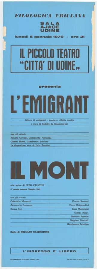 Il Piccolo Teatro città di Udine presenta L'emigrant a cura di Rodolfo de Chmielewski, Il mont di Lelo Cjanton