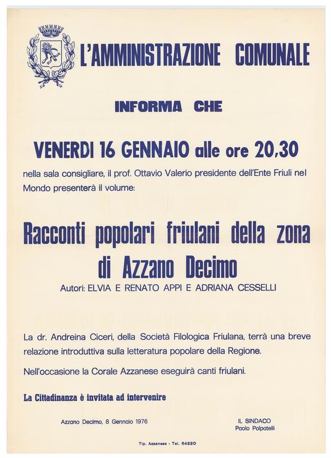 Il prof. Ottavio Valerio presidente dell'Ente Friuli nel Mondo presenterĂ il volume: Racconti popolari friulani della zona di Azzano Decimo