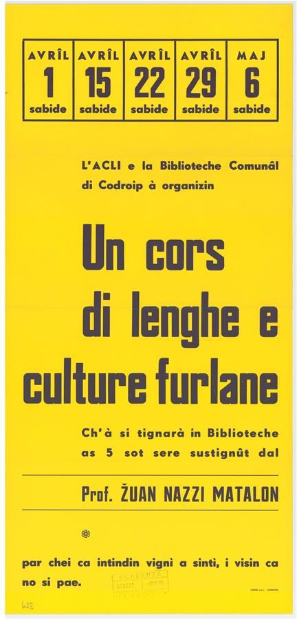 L'ACLI e la Biblioteche Comunâl di Codroip à organizin un cors di lenghe e culture furlane