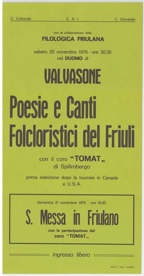 Nel duomo di Valvasone poesie e canti folcloristici del Friuli con il coro Tomat di Spilimbergo; S. Messa in friulano con la partecipazione del coro Tomat