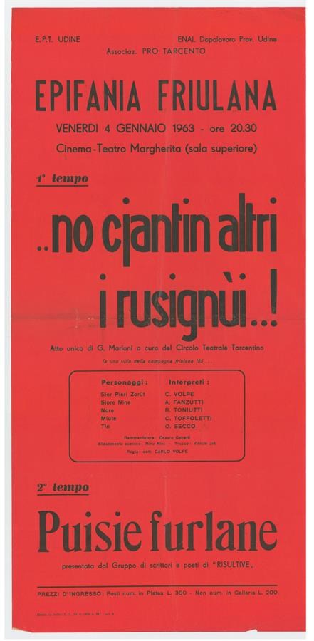 Spettacolo teatrale a cura del Circolo Teatrale Tarcentino e recita di poesie friulane a cura del Gruppo di scrittori e di poeti di "Risultive" in occasione dell'Epifania presso il Cinema-Teatro Margherita di Tarcento