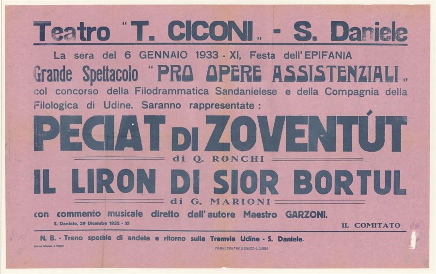 Grande spettacolo pro opere assistenziali col concorso della Filodrammatica Sandanielese e della Compagnia della Filologica di Udine in occasione della Festa dell'Epifania al Teatro T. Ciconi di San Daniele