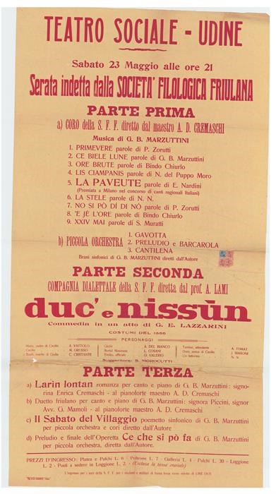 Coro della S.F.F.; Duc’ e nissùn, commedia di G. E. Lazzarini; Larin lontan; Il sabato del villaggio; Ce che si po’ fa, opere di G.B. Marzuttini