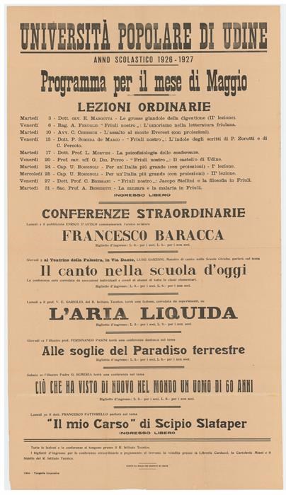 Programma per il mese di maggio dell'Università popolare di Udine, anno scolastico 1926-1927