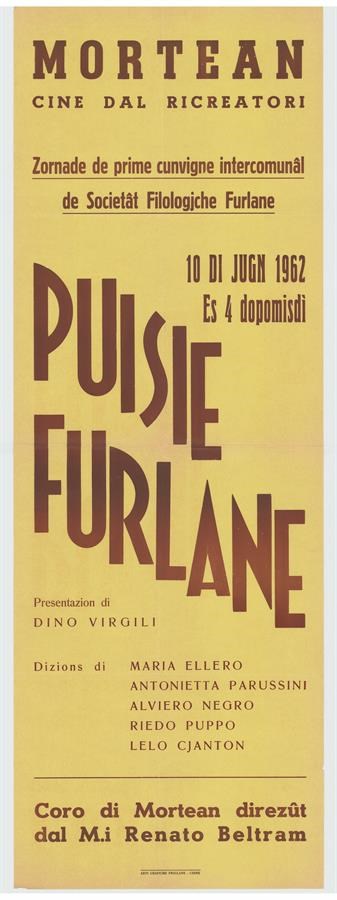 Recita di poesie friulane, presentata da Dino Virgili e a cura di Maria Ellero, Antonietta Parussini, Alviero Negro, Riedo Puppo e Lelo Cjanton, in occasione del I. Convegno intercomunale della Società Filologica Friulana a Mortegliano