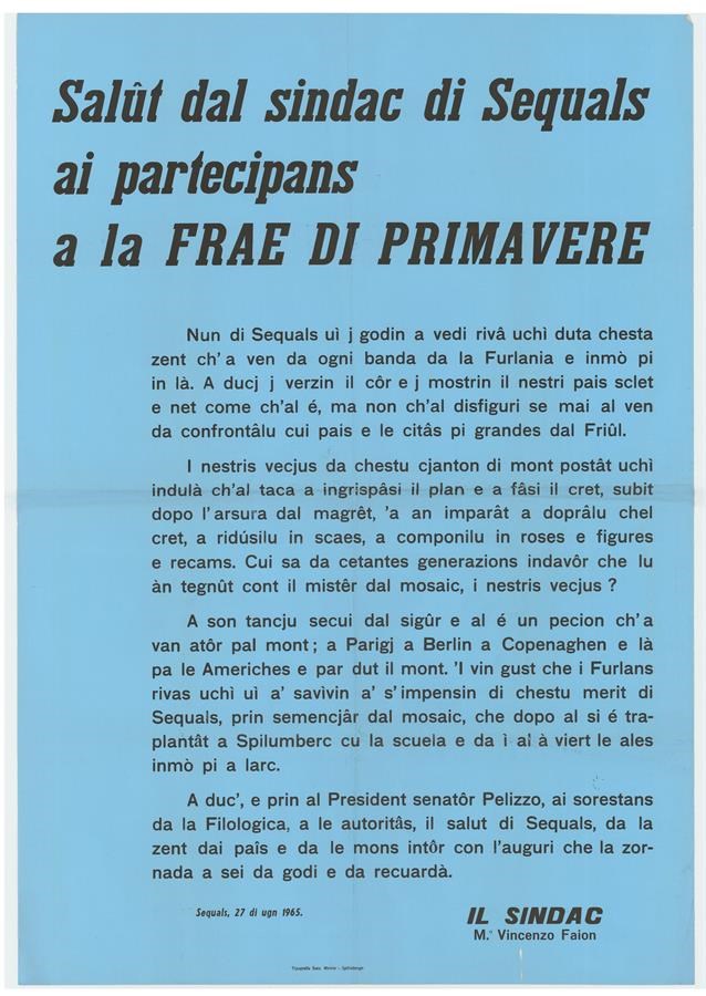 Discorso di Vittorio Faion, sindaco di Sequals, in occasione della "Frae di primavere" organizzata dalla Società Filologica Friulana