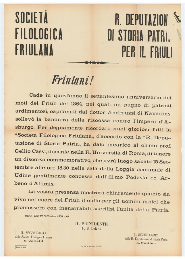 Discorso del Presidente P. S. Leicht in cui Società Filologica Friulana e Deputazione di storia patria per il Friuli annunciano il discorso commemorativo di Gellio Cassi che avrà luogo sabato 15 settembre 1934 presso la Loggia comunale di Udine