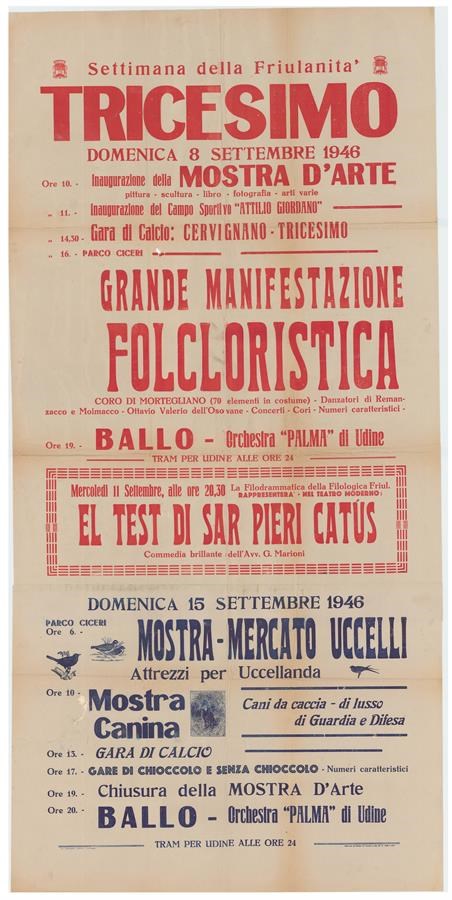 Programma della Settimana della friulanità a Tricesimo con la Grande manifestazione folcloristica con la partecipazione del Coro di Mortegliano e dei Danzatori di Remanzacco e Moimacco e la rappresentazione de "El test di Sar Pieri Catus" di G. Marioni a cura della Filodrammatica della Società Filologica Friulana