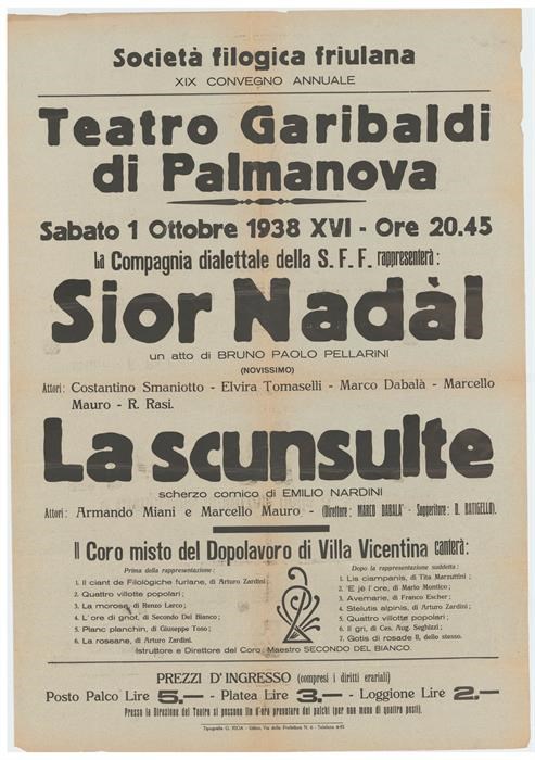 Spettacoli teatrali a cura della Compagnia dialettale udinese e canti del Coro misto del Dopolavoro di Villa Vicentina nel Teatro Garibaldi di Palmanova