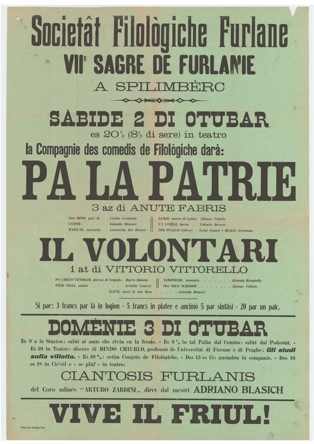Programma della VII Sagre de Furlanie della Società Filologica Friulana a Spilimbergo. Pa la patrie di Anute Fabris; Il volontari di Vittorio Vittorello.