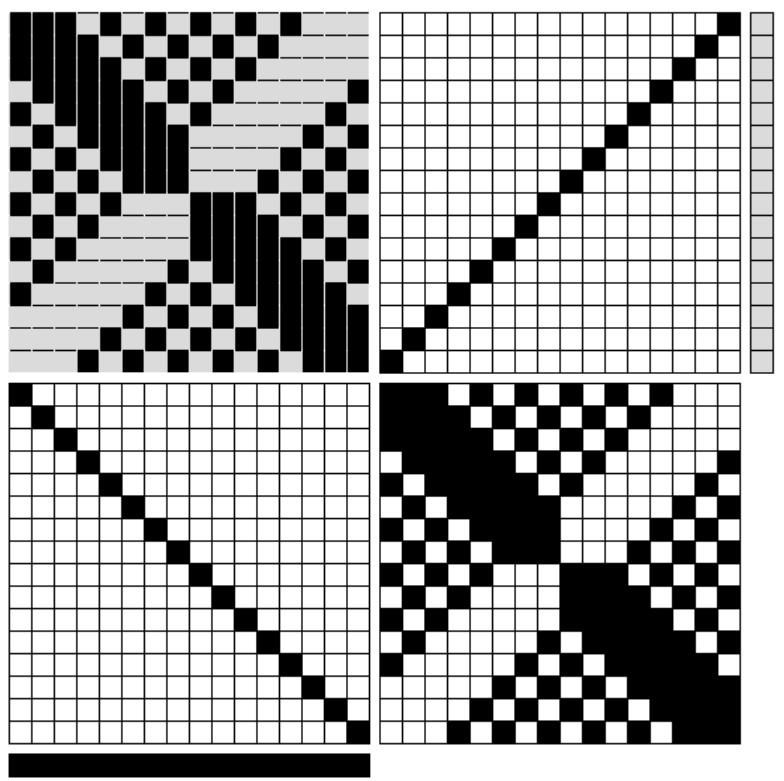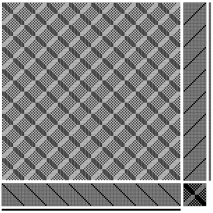 Versione in disegno tecnico tessile contemporaneo. Il rapporto di armatura (1) e la sua ripetizione (2) sono stati elaborati al computer con il programma WeaveDesign.