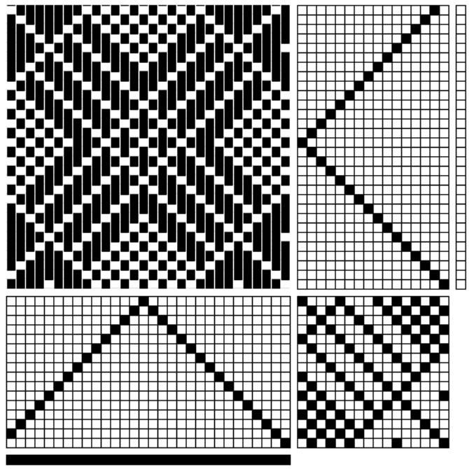 Versione in disegno tecnico tessile contemporaneo. Il rapporto di armatura (1) e la sua ripetizione (2) sono stati elaborati digitalmente