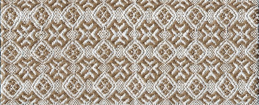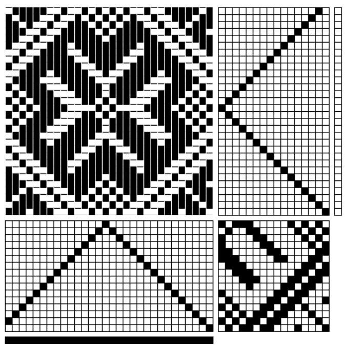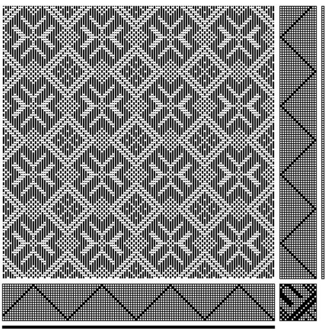 Versione in disegno tecnico tessile contemporaneo. Il rapporto di armatura (1) e la sua ripetizione (2) sono stati elaborati al computer con il programma WeaveDesign.