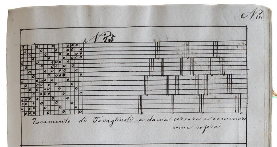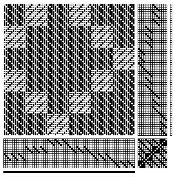 Progetto per tessuto N.13 Versione in disegno tecnico tessile contemporaneo. Il rapporto di armatura (1) e la sua ripetizione (2) sono stati elaborati al computer con il programma WeaveDesign.