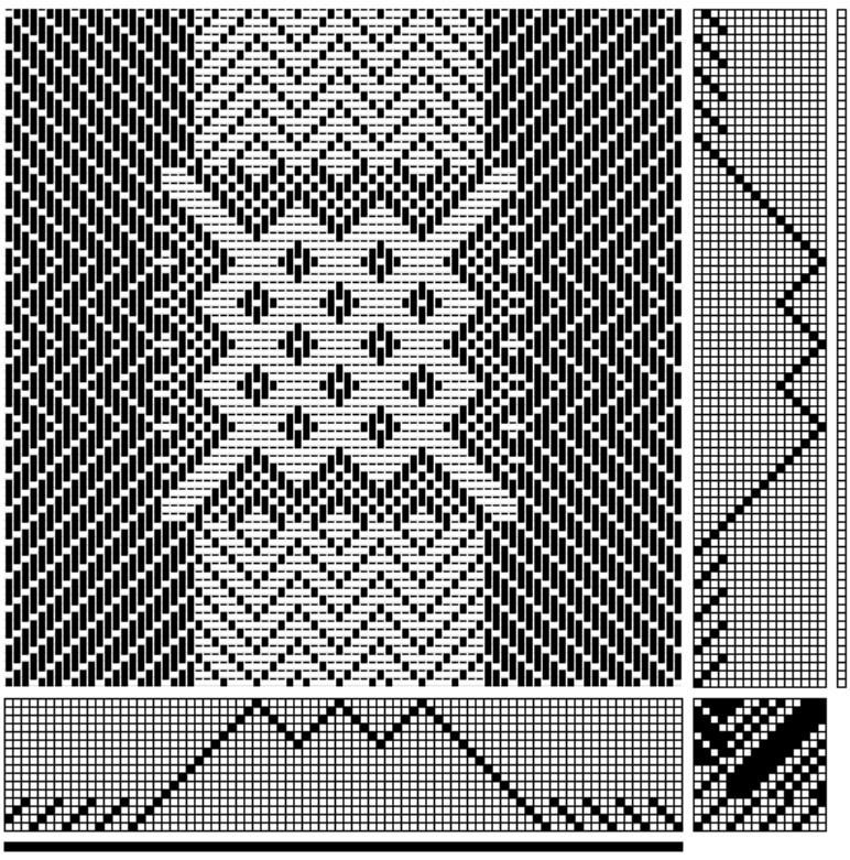 Versione in disegno tecnico tessile contemporaneo. Il rapporto di armatura (1) e la sua ripetizione (2) sono stati elaborati al computer con il programma WeaveDesign