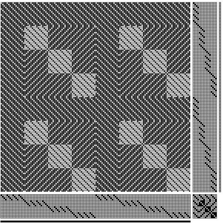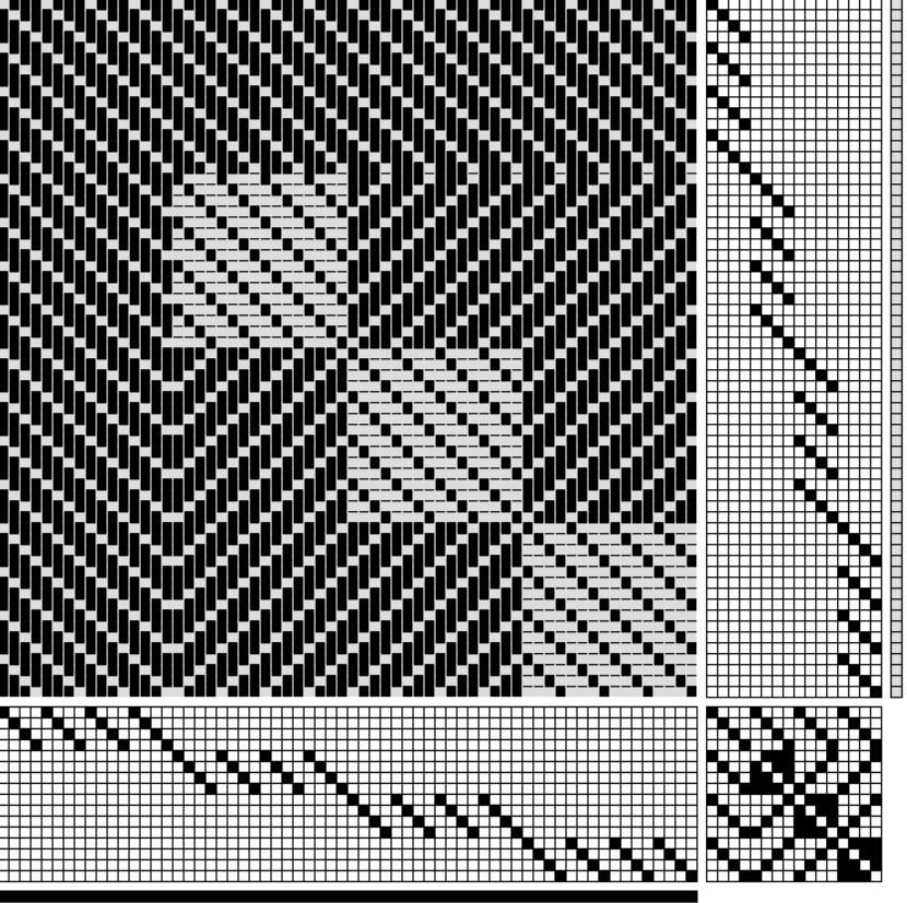 Versione in disegno tecnico tessile contemporaneo. Il rapporto di armatura (1) e la sua ripetizione (2) sono stati elaborati al computer con il programma WeaveDesign.